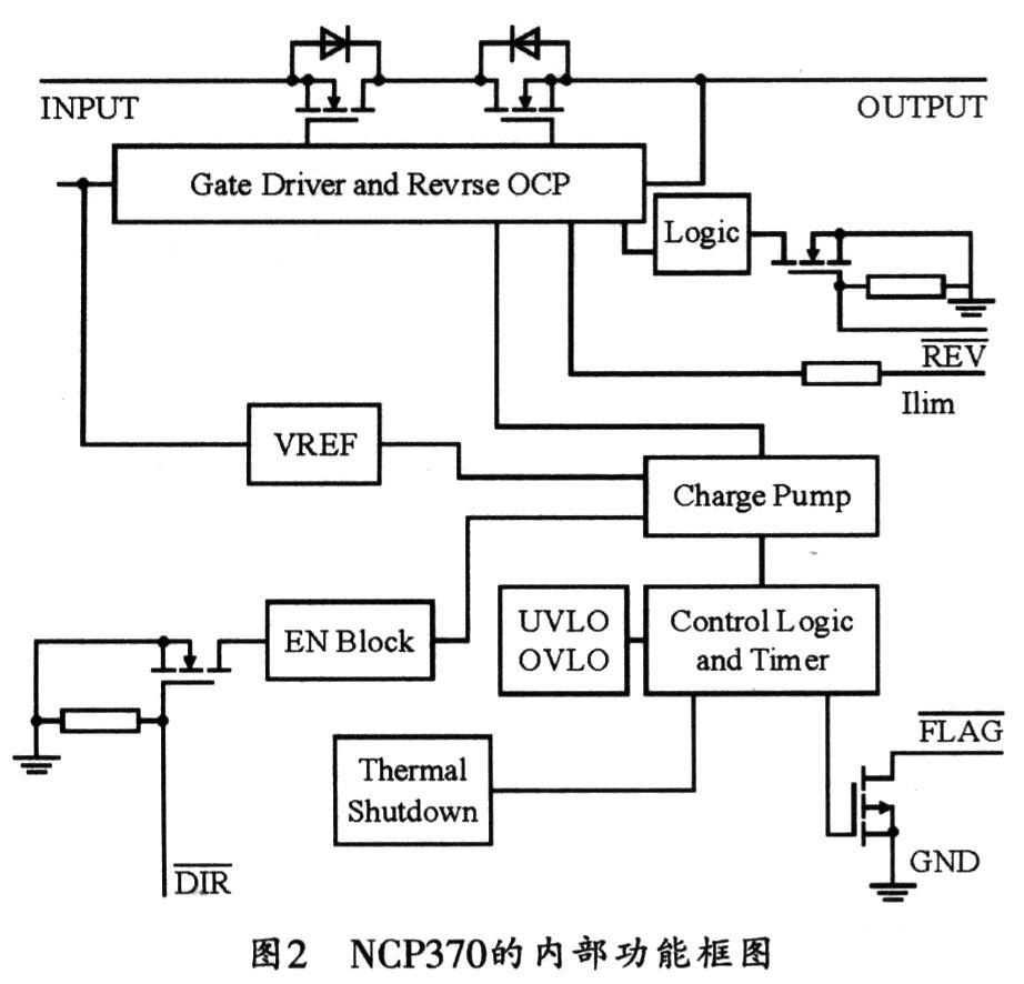 將外設(shè)連到IN端,NCP370便可進入反向模式。此時,外設(shè)內(nèi)部的電池可由NCP370的OUT端來供電。在反向模式下,NCP370的REV端必須置低,這樣,當外設(shè)發(fā)生過壓、欠壓或過流等故障時,NCP370內(nèi)部的過壓、欠壓或過流保護電路才會起作用,同時其FLAG也才會向系統(tǒng)發(fā)出報警信號。圖2所示是NCP370的內(nèi)部功能框圖。