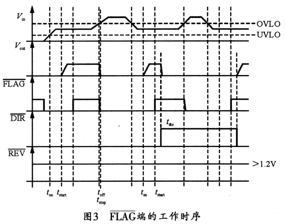 NCP370內(nèi)含一個FLAG報警提示引腳。一旦NCP370檢測到輸入電壓高于OVLO閥值、低于U-VLO閥值或過流、過壓等故障,F(xiàn)LAG端就會置低,并通知微控制器采取適當?shù)拇胧6斴斎腚妷夯謴?fù)到正常范圍時,F(xiàn)IAG又會在經(jīng)過一個延遲后置高,隨后使Vout恢復(fù)輸出,其工作時序如圖3所示。
