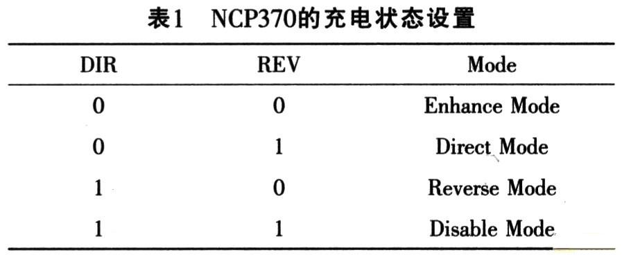 將NCP370的DIR端強制拉低,并將DEV端拉高,NCP370即可進入正向充電狀態(tài)。而將DIR端置高時,OUT端會與IN端斷開,具體的充電狀態(tài)設(shè)置如表1所列。另外,DIR也會受到OVLO或U-VLO故障的影響(FLAG有效)。