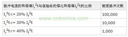 每次脈沖沖擊保險(xiǎn)絲,保險(xiǎn)絲都會(huì)受到一定的損傷,經(jīng)過(guò)多次反復(fù)沖擊保險(xiǎn)絲就會(huì)熔斷。以下為AEM產(chǎn)品耐受沖擊次數(shù)的表格: