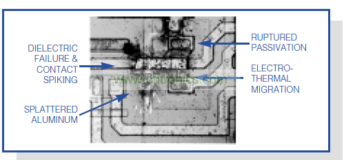 圖1中的顯微圖片表明競爭對手的RS-232接口芯片在受到15kV(一般測試水平)的ESD沖擊后的損壞情況,強大的壓力使芯片內的金屬汽化,結果造成明顯的大面積損壞。其它情況下,考察柵氧化層或