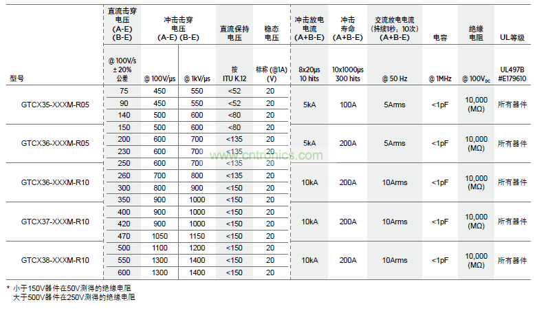 表 G1 兩電極GDT器件額定電壓值、額定浪涌值、電容值、絕緣電阻值和安規認證