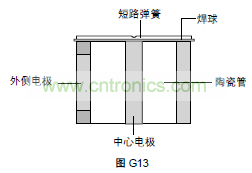 失效保護機構是焊接在中心電極上帶塑料薄片的短路簧片。在正常的工作條件下,塑料薄片與兩個外側電極隔離,如圖G13。當長時間放電使氣體放電管溫度達到塑料薄片的熔點時,塑料薄片就會被軟化,促使短路彈片被激活,并與兩個外側電極搭接。這個過程導致三個電極之間永久短路,建立起一條低阻抗路徑,將故障電流引到地面,而不會產生顯著的熱量。