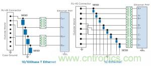 對于機頂盒設備上的 RJ45 端口,同樣考慮到因為頻繁插拔時由于靜電而導致的設備損害,在端口也可以增加上 SESD 器件來保護靜電干擾。圖4分別展示了在 10/100baseT 及 1G Ethernet 上使用 SESD 器件進行保護的應用。