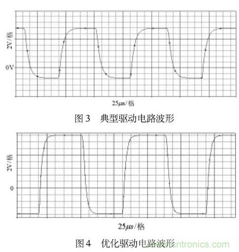 圖3為實測典型驅動電路驅動波形,圖4為實測優化驅動電路波形。通過兩圖的對比,不難看出,典型驅動電路的反向關斷電壓不到-5V,正向驅動電壓小于14.5V。而優化驅動電路的反偏壓則基本達到或接近于-8V,正向驅動電壓更是超過了+15V,正反向驅動電壓值得到調整的同時,前后沿陡度也得到極大改善。