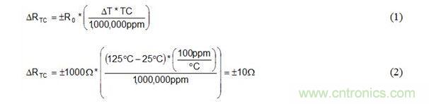 公式 1 和 公式 2 是溫度從 25°C 到 125°C 變化時,如何使用電阻器 TC 規范計算 1kΩ、±100ppm/°C 電阻器阻值 ΔRTC 變化的實例。
