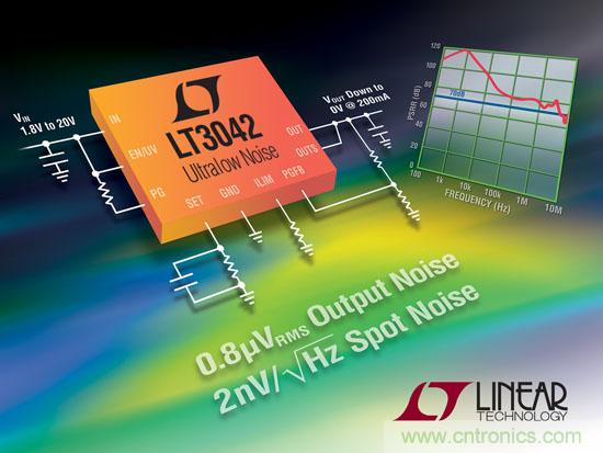 【導讀】近日,凌力爾特公司推出領先的具備超低噪聲、超高電源紋波抑制的低壓差電壓線性調節器 LT3042。該器件的優勢在于具有僅為 2nV/√Hz (在 10kHz) 的超低點噪聲和 0.8µVRMS 的積分輸出噪聲 (在 10Hz 至 100kHz 的寬帶寬內)。該器件低頻和高頻 PSRR 性能使其占有巨大的優勢。低頻 PSRR 超過 90dB (直到 10kHz),而高頻 PSRR 則超過 75dB (直到 3MHz),可使噪聲或高紋波輸入電源變得 “安靜”。