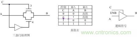 當(dāng)控制端C為“0”時,3、4管都截止,輸入端A的電平狀況無法到達(dá)輸出端B,輸出端B呈現(xiàn)高電阻的狀態(tài),稱為“高阻態(tài)”。