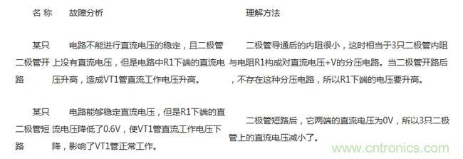 (2)二極管眾多的特性中只有導通后管壓降基本不變這一特性能夠最為合理地解釋這一電路的作用,所以依據這一點可以確定這一電路是為了穩定電路中A點的直流工作電壓。