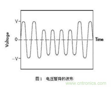 電壓暫降就是電壓突然降低,但是在很短時間內(nèi)又恢復(fù)正常,如圖1 所示,電壓暫降與電壓過低的區(qū)別是電壓暫降的時間很短,但是降低的幅度很大,有時暫降后的電壓僅為正常電壓的10%。