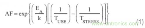 JEDEC和AEC標準均基于健全完善的基本原理,不過技術上比較落后。雖然通過硅產品質量鑒定是一件有價值的、里程碑式的重大事件,但是用戶需要一個能夠在實際使用條件下,在所需的使用壽命內,比如說10年,以低故障率持續運行的產品。因此,推出FRAM、成比例CMOS、GaN等新技術的公司需要了解這些標準的基本原理。在JEDEC質量鑒定方法體系中,主要的促進要素是溫度。根據方程式eq.(1)計算出加速因子 (AF),在這里EA是激活能量,而k是玻爾茲曼常數。