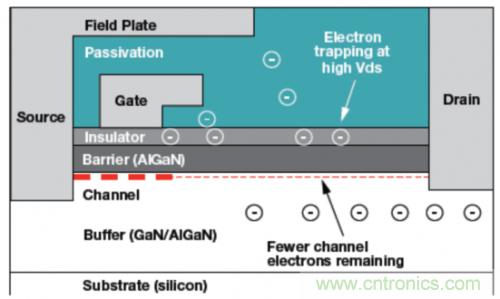 圖1:一個GaN器件的電路橫截面顯示被陷獲的電子如何通過減少通道層中的電子數量來增加Rds導通電阻。