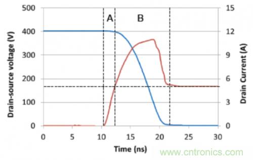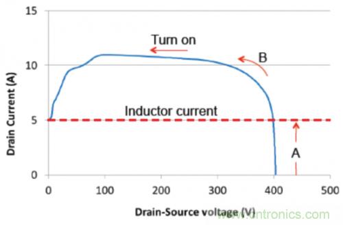 器件應力由使用圖2中所示拓撲的升壓轉換器顯示。圖3中顯示的是初級側開關 (FET1) 上硬開關接通變換的仿真結果。輸入電壓為200V,而電感器電流為5A(負載電流大約為2.5A)。在這個情況下,當FET1關閉時,由于鉗制FET (FET2) 導電,它的漏電壓大約鉗制在400V。因此,當FET1接通時,它需要在Vds開始下降之前灌入整個電感器電流(區域A)。