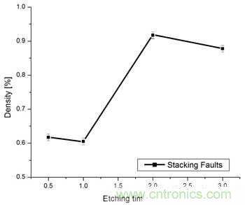 圖1.層錯密度是蝕刻時間的函數,隨蝕刻時間增加而上升。