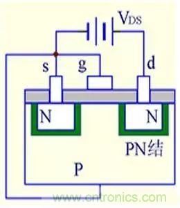 (1) VGS=0時,不管VDS極性如何,其中總有一個PN結反偏,所以不存在導電溝道。