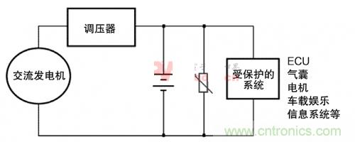 圖3.MOV對(duì)汽車子系統(tǒng)供交流發(fā)電機(jī)瞬態(tài)保護(hù)