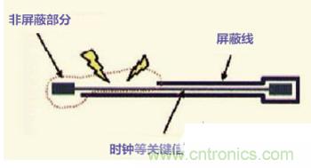 在高速的PCB設(shè)計(jì)中,時(shí)鐘等關(guān)鍵的高速信號(hào)線,走線需要進(jìn)行屏蔽處理,如果沒(méi)有屏蔽或只屏蔽了部分,都會(huì)造成EMI的泄漏。建議屏蔽線,每1000mil,打孔接地。