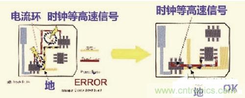所有的高速信號(hào)必須有良好的回流路徑。盡可能地保證時(shí)鐘等高速信號(hào)的回流路徑最小。否則會(huì)極大的增加輻射,并且輻射的大小和信號(hào)路徑和回流路徑所包圍的面積成正比。