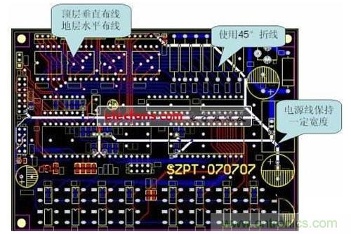 (2)合理安排接口元器件的位置和方向。一般來說,作為電路板和外界(電源、信號線)接的連接器元器件,通常置在電路板的邊緣,如串口和并口。放在電路板的中央,不利于接線,也可能因為其他元器件的阻礙而無法連接。另外還要注意接口的方向,使連接線可以順利地引出,遠離電路板。接口放置后,應(yīng)當利用接口元器件的String(字符串)清晰地標明接口的種類;對于電源類接口,應(yīng)當標明電壓等級,防止因接線錯誤導(dǎo)致電路板燒毀。
