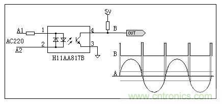 過零點檢測可采用硬件實現,在硬件設計中,可以增加如圖4 或圖5過零點的硬件檢測電路,通過在B端輸出為高電平時進行按鍵狀態的判斷,以期在電磁輻射最小的時候對觸摸按鍵進行檢測。