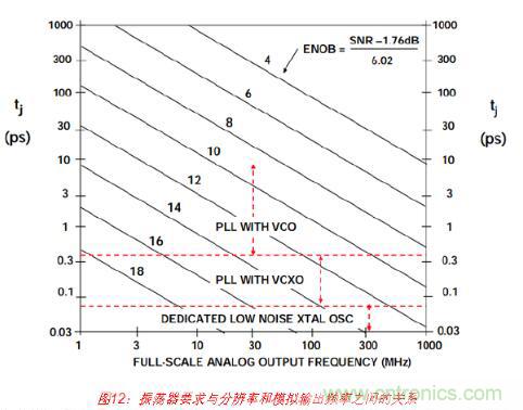 圖12顯示的是與圖10相同的數(shù)據(jù),但其中針對(duì)各種分辨率要求繪制出與模擬輸出頻率成 函數(shù)關(guān)系的最大允許抖動(dòng)。根據(jù)最大輸出頻率和ENOB中所需分辨率來(lái)選擇采樣時(shí)鐘發(fā)生 器類型,應(yīng)以此圖片作為大概準(zhǔn)則。具有標(biāo)準(zhǔn)VCO的PLL方法就是產(chǎn)生采樣時(shí)鐘的一種 不錯(cuò)方式,其中均方根(RMS)抖動(dòng)要求大約為1 ps或以上。不過(guò),亞皮秒抖動(dòng)要求采用基 于VCXO的PLL或?qū)S玫驮肼暰w振蕩器。“教程MT-008”介紹了如何將振蕩器相位噪聲轉(zhuǎn) 換成抖動(dòng)。