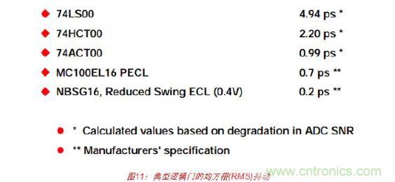 為了顯示這些抖動(dòng)值的重要性,請(qǐng)考慮與一組邏輯門相關(guān)的均方根(RMS)抖動(dòng)典型值,如 圖11所示。74LS00、74HCT00和74ACT00的值都是采用參考文獻(xiàn)1第5章所述的方法以高 性能ADC(孔徑抖動(dòng)小于0.2-ps rms)測(cè)得的,其中抖動(dòng)是從因多個(gè)相同門串聯(lián)而導(dǎo)致的FFT SNR降低計(jì)算得出的。然后,通過(guò)除以串聯(lián)門總數(shù)的平方根,便可計(jì)算出單個(gè)門所造成 的抖動(dòng)。制造商給出了MC100EL16和NBSG16的抖動(dòng)數(shù)據(jù)。