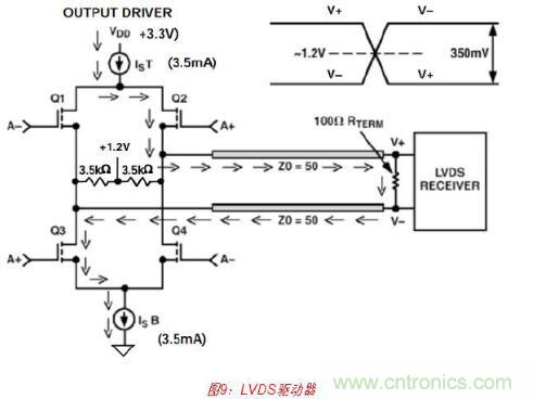 當(dāng)并行數(shù)據(jù)速率超過(guò)約100 MSPS時(shí),由于不太可能會(huì)產(chǎn)生CMOS邏輯電平以上的瞬變干 擾,因此通常使用低電平電流模式差分邏輯(PECL、較低級(jí)別的PECL或LVDS等)(見圖 9)。這樣可幫助最大程度地減少因碼相關(guān)毛刺而產(chǎn)生的失真。例如,AD9734/AD9735/ AD9736 DAC系列采用1.2 GSPS并接受LVDS輸入邏輯電平。片上包含特殊電路,以確保 輸入數(shù)據(jù)相對(duì)于DAC時(shí)鐘具有正確時(shí)序