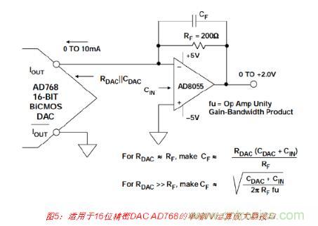 通過(guò)使用單個(gè)運(yùn)算放大器作為I/V轉(zhuǎn)換器,便可輕松執(zhí)行單端電流電壓轉(zhuǎn)換,如圖5所 示。AD768的10 mA滿量程DAC電流輸出可以在200 Ω RF電阻上產(chǎn)生0至+2 V的輸出電 壓。