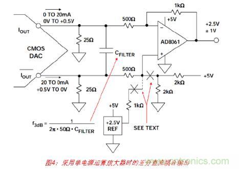 但是應(yīng)注意,與差分工作模式相比,以這種方式使用DAC的單端輸出時(shí),共模抑制性能將 下降,且2階失真產(chǎn)物將增加。