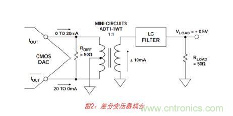 變壓器不僅用于將差分輸出轉(zhuǎn)換成單端信號(hào),而且還將DAC的輸出與LC濾波器的抗性負(fù) 載隔離開來(lái),因而可以改善整體失真性能。