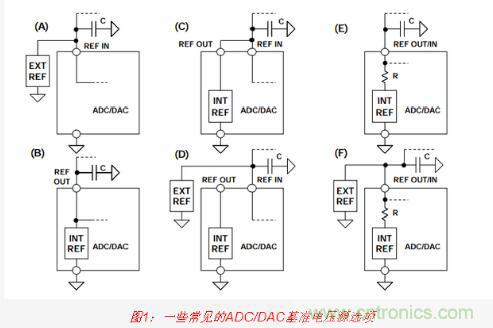 各種各樣的ADC和DAC以各種各樣的方式支持使用外部基準(zhǔn)電壓源來(lái)替代內(nèi)部基準(zhǔn)電壓源。圖1所示為一些常見配置(但顯然并不是全部)。