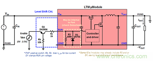 由于接地電平(PGND和GND)的不同,配置控制電路需要比功率級更多考慮。μModule穩壓器參考其自身GND引腳的引腳電壓,但其提供的輸出電壓是相對于系統地(PGND)的。在此配置中,要將任何PGND參考的外部控制信號(例如RUN,TRACK,PGOOD等)傳送到μModule穩壓器,需要將信號轉換為μModule穩壓器的接地參考GND(-V OUT)。