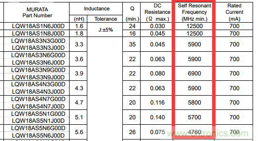圖1 murata LQW18AS系列spec中的SRF信息