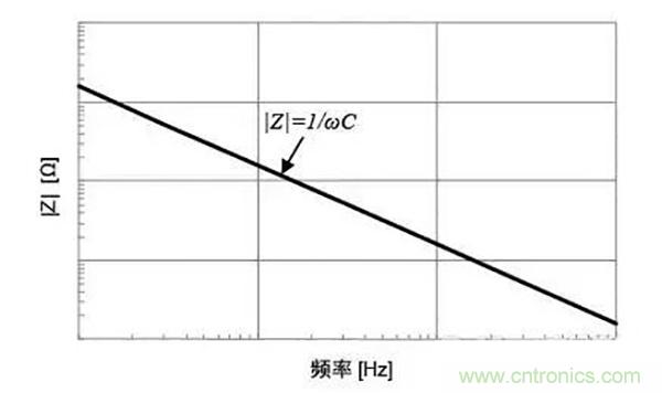 由公式(1)可看出,阻抗大小|Z|如下圖所示,與頻率呈反比趨勢p少。由于理想電容器中無損耗,故等價(jià)串聯(lián)電阻(ESR)為零。