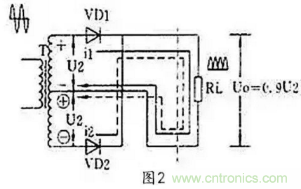 全波整流則是要用到二個二極管,ASEMI工程上也會要求需要有帶中心抽頭的兩個次級線圈,這兩個次級線圈需要圈數相同,以保證相同的電阻。詳細的情況我們可以看下圖2,負載RL得到的就是全波整流電流,輸出電壓比半波整流電路要高。