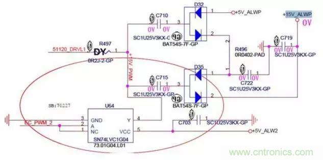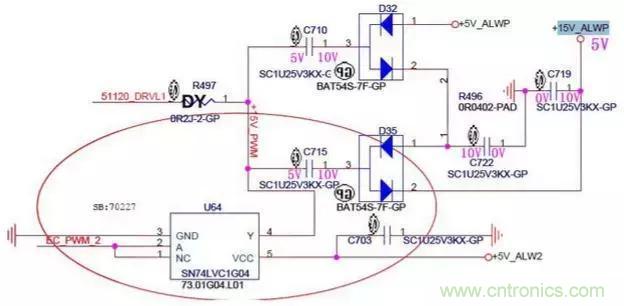 1.由于電容兩端的電壓不能突變,此時C715兩端的電壓為左邊5V,右邊為10V,然后電流經過D35的2引腳對C719電容充電,充完電后C719的電壓升到了10V。