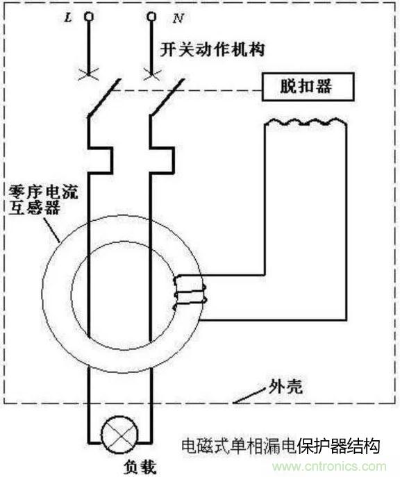 像我們家中的漏電保護器的原理圖就如上圖一般,漏電保護器就是一種電流形繼電器,當電流大于設定值的時候是開關跳閘。