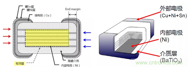 陶瓷電容主要由兩部分組成,陶瓷電容本體和外部電極組成。本體部分由內部電極和介質層組成,外部電極由銅鎳錫三層組成,柔性電容會在銅鎳之間多加一層Soft Term層,增加可靠性。