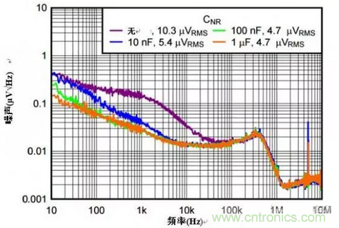為該引腳添加一個電容器(CNR/SS),就可以形成具有內部電阻的RC濾波器,有助于把由參考電壓生成的無用噪聲分流。由于參考電壓是噪聲的主要來源,增加電容可推送左側低通濾波器的截止頻率。圖 4 顯示了該電容器對輸出噪聲的作用結果。