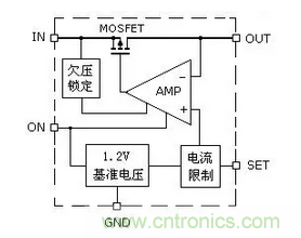 AAT4610將6V/2A的P溝道MOSFET場效應管與柵極驅動器、電壓基準、限流比較器和欠壓閉鎖電路組合在SOT-23-5封裝中(如圖2)。其中MOSFET是一個電子開關,它的通斷受比較器輸出電壓的控制,如果輸出電流大于設定電流,運算放大器AMP輸出負電壓,關斷MOSFET,停止電壓輸出,對供電電路起到保護作用。MOSFET的溝道電阻最大值僅為180mΩ,關斷模式下靜態電流為1mA。MOSFET的工作電壓為2.7V~5.5V,輸入電壓低于2.7V時,由欠壓鎖定電路關斷MOSFET,對供電電路進行欠壓保護。