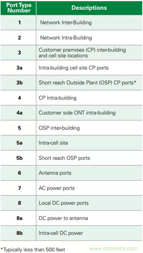 在美國,電信公司在網絡側安裝設備的電路保護(例如,安裝光纖網絡終端單元或ONT的附近機柜中)必須符合NEBS(網路設備建設系統)設計指南,這反過來可能需要符合GR-1089第6期端口類型3浪涌。由于這些回路很短,端口類型可被指定為類型3a / 5a。每個供應商應界定其自身的防雷電要求。端口類型3是這類設備中的最嚴重情況。欲了解有關端口類型的更多信息,請參見表2。