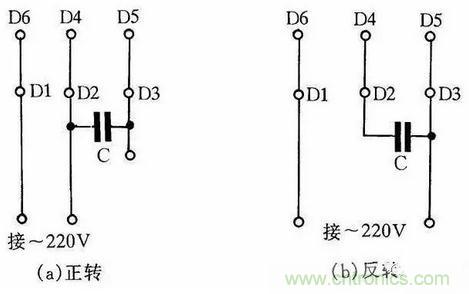 圖4是JX07A-4型單相電容運轉(zhuǎn)電動機接線方法。電動機功率為60W,用220V/50Hz交流電源、電流為0.5A。它的轉(zhuǎn)速為每分鐘1400轉(zhuǎn)。電容選用耐壓400~500V、容量8μF的產(chǎn)品。圖4(a)為正轉(zhuǎn)接線,圖4(b)為反轉(zhuǎn)接線。