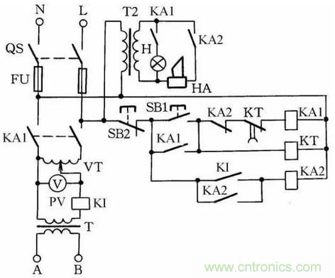 這種絕緣耐壓測試儀可測燈具,將待測燈具與A、B兩接線柱接好,按下按鈕SB1,中間繼電器KA1得電并自鎖;然后將調壓器VT(1∶10,輸出0~250V)調至需測的電壓值,如需調到1500V則將VT調到電壓表指示150V(同理,作2000V耐壓時,調到電壓表指示200V),經時間繼電器KT延時后,電源自動切斷,見圖21。