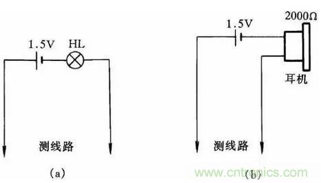 圖27(a)、(b)是最簡便的線路通斷檢測器。當測得導線通路時,燈泡會發光,耳機在通斷瞬時會發響;當線路斷路時,耳機不響,燈泡不亮。這種方法簡單易行,非常適合初學電工制作工具儀表或代替萬用表做測量,其優點是攜帶方便。