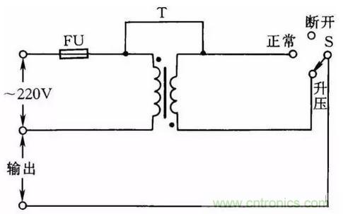 有些地區的電壓常低于220V;而有些地區的電壓則高于220V;那么用現有的雙繞組變壓器接成自耦變壓器來升高或降低電源電壓;即能使額定電壓為220V的用電器正常工作;如圖33所示。當開關S打在“升壓”位置時;變壓器相當于一個自耦變壓器;將電源電壓升高6.3V;如將開關S打在“正常”位置時;負載是直接接到電源上;輸出電壓仍為電源電壓。