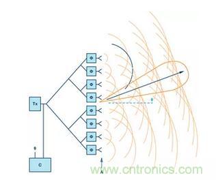 圖1展示了如何通過調整每個天線中信號的相位,將有效波束控制在線性陣列的目標方向上。結果,陣列中的每個天線都具有獨立的相位和幅度設置,以形成期望的輻射圖。由于沒有機械運動部件,所以很容易理解相控陣中波束快速轉向的屬性。