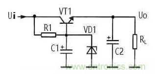 R1 同時還是 VD1 的限流保護電阻。在加入穩(wěn)壓二 極管 VD1 后,改變 R1 的大小不能改變 VT1 發(fā)射極輸出電壓大小,由于 VT1 的發(fā)射結存在 PN結電壓降,所以 發(fā)射極輸出電壓比 VD1 的穩(wěn)壓值略小。