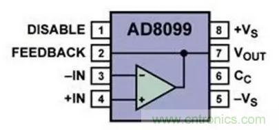 採用低失真引腳排列的一些運算放大器,有助于消除上面提及的兩個問題;而且它還提高了其他兩個重要方面的性能。LFCSP的低失真引腳排列,如(圖十)所示,將傳統運算放大器的引腳排列按著逆時針方向移動一個引腳,并且增加了一個輸出引腳作為專用的反饋引腳。