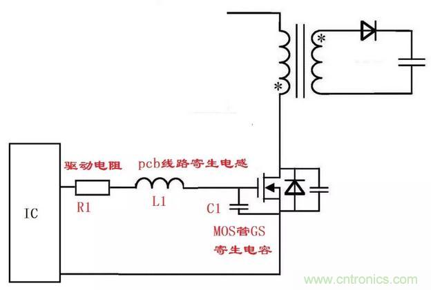 IC出來的波形正常,到C1兩端的波形就有振蕩了,實際上這個振蕩就是R1,L1和C1三個元器件的串聯振蕩引起的,R1為驅動電阻,是我們外加的,L1是PCB上走線的寄生電感,C1是mos管gs的寄生電容。