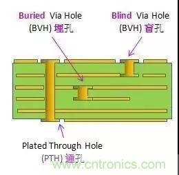 這個(gè)制作過程不能通過電路板黏合后再進(jìn)行鉆孔的方式達(dá)成,必須要在個(gè)別電路層的時(shí)候就進(jìn)行鉆孔操作,先局部黏合內(nèi)層之后進(jìn)行電鍍處理,最后全部黏合。由于操作過程比原來(lái)的導(dǎo)通孔和盲孔更費(fèi)勁,所以價(jià)格也是最貴的。這個(gè)制作過程通常只用于高密度的電路板,增加其他電路層的空間利用率。